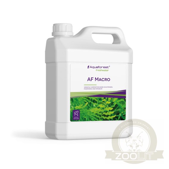 To precyzyjnie dobrana i zbilansowana kompozycja zawierająca azot, fosfor, potas i magnez. Makroelementy to podstawowe pierwiastki budulcowe. Biorą udział w tworzeniu wielu struktur komórkowych, białek i enzymów. Ponadto pełnią rolę przenośników i akumulatorów energii oraz wchodzą w skład kwasów nukleinowych. Objawy niedoboru, bądź nadmiaru określonego składnika zależne są od pełnienia w roślinie konkretnych funkcji. Zwykle niedobór jakiegoś makroelementu przejawia się zahamowaniem wzrostu, wyrastaniem osłabionych pędów i odbarwieniem części roślin. Nadmiar zaś powoduje wybujały wzrost, ciemnozielone liście (w przypadku zbyt dużej ilości azotu), przy czym cała roślina jest słaba i podatna na wszelkie urazy. AF Macro to podstawowy nawóz konieczny do prawidłowego rozwoju roślin akwariowych.