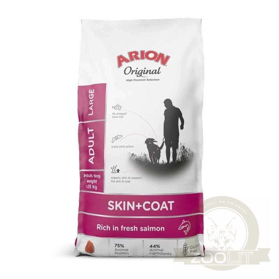 Arion Original Skin & Coat Adult Large to pełnowartościowa karma stworzona specjalnie dla dorosłych psów ras dużych, zawierająca świeży łosoś. Jej bezglutenowa, monobiałkowa receptura oparta na rybach jest wzbogacona o unikatową mieszankę składników pochodzenia morskiego oraz cynk organiczny, wspierając zdrowie skóry i sierści. Dodatkowo karma zawiera chondroprotektory, które pomagają w utrzymaniu zdrowych stawów.