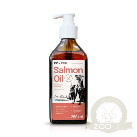 Lab-v Olej Z Łososia 100% Dla Psa i Kota 250ml - Naturalny olej z łososia, bogaty w kwasy omega-3 i omega-6, wspiera zdrowie skóry, sierści, układu pokarmowego, a także kondycję serca, stawów i układu nerwowego. Idealny dla psów i kotów w każdym wieku.