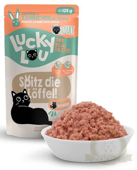 Gdzie indziej jest nudne standardowe jedzenie - Lucky Lou jest dostępne w 18 różnych odmianach smakowych w saszetkach 125 g oraz w puszkach 200 g i 400 g. Karma produkowana w Niemczech.