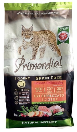 Primordial Grain-Free Adult Neutered Exigent Łosoś & Przepiórka to bezzbożowa, pełnoporcjowa karma dla sterylizowanych kotów.
