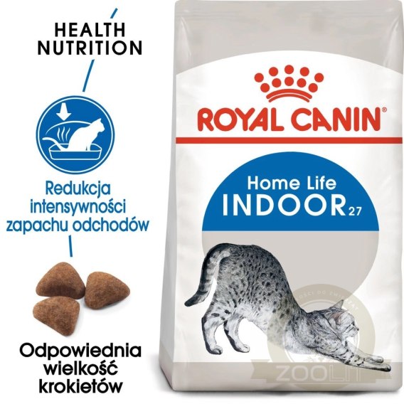 Koty dorosłe przebywające w domu są mniej aktywne od wychodzących, dlatego wymagają odpowiednio zbilansowanej karmy, pokrywającej wszystkie ich potrzeby żywieniowe. Karma ROYAL CANIN Indoor 27 zawiera wysokostrawne białka L.I.P., wyselekcjonowane ze względu na bardzo wysoką przyswajalność. Dzięki temu karma sprzyja zmniejszeniu intensywności zapachu i objętości odchodów, czyli objawów słabego pasażu jelitowego spowodowanego niską aktywnością. Karma dla kotów od 1 do 7 roku życia przebywających wyłącznie w domu.