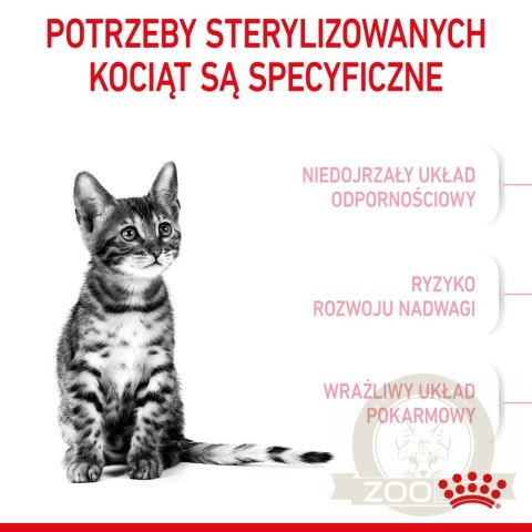 Kocię rozwija się stopniowo i z ciekawością eksploruje otoczenie, dlatego w okresie od 6 do 12 miesiąca układ odpornościowy kocięcia wymaga dodatkowego wsparcia - szczególnie, jeśli został wysterylizowany. Karma ROYAL CANIN Kitten Sterilised została opracowana specjalnie z myślą o potrzebach kociąt. Odpowiednie składniki sprzyjają rozwojowi naturalnych mechanizmów obronnych organizmu kocięcia po sterylizacji, wspierając prawidłowy rozwój w drugim okresie wzrostu.