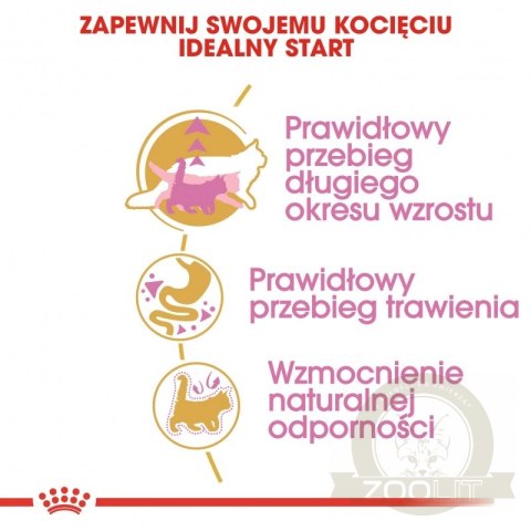 ROYAL CANIN Maine Coon Kitten to karma opracowana specjalnie dla kociąt rasy maine coon do 15 miesiąca życia. Odpowiednio dostosowana dieta dba o prawidłowy rozwój kocięcia przez cały okres wzrostu. Układ pokarmowy kocięcia cały czas się rozwija. Dla prawidłowego przebiegu trawienia ważne są białka wysokiej jakości. Karma ROYAL CANIN Maine Coon Kitten zawiera wysokostrawne białka L.I.P. oraz prebiotyki sprzyjające równowadze flory bakteryjnej jelit. Układ immunologiczny rozwija się przez cały okres wzrostu.