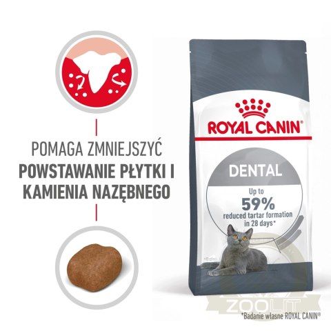 Unikalny kształt i tekstura krokieta zachęcają do dłuższego rozgryzania karmy. Mechaniczny efekt czyszczący w trakcie jedzenia sprzyja usuwaniu płytki nazębnej. Receptura została wzbogacona o aktywną substancję, która wiążąc wapń obecny w ślinie, zapobiega jego odkładaniu na zębach i powstawaniu kamienia nazębnego. Udowodniona skuteczność: do 59% redukcji odkładania się kamienia nazębnego po 28 dniach podawania kotu wyłącznie karmy ROYAL CANIN Oral Care.
