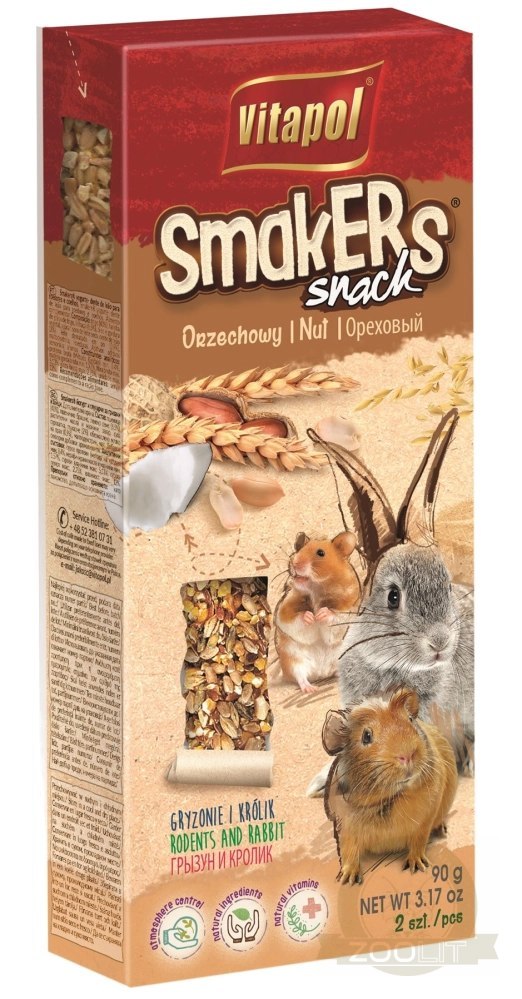 Smakers stanowi urozmaicenie i uzupełnienie diety gryzoni i królików. Pełen smakowitych orzechów, które uzupełniają dietę gryzoni w witaminę E, która działa ochronnie na układ nerwowy i układ odpornościowy, jest doskonałym przeciwutleniaczem. Poza tym orzechy są bogatym źródłem magnezu oraz witaminy B i B1, a zawarte w nim tłuszcze to głównie korzystne dla zdrowia nienasycone kwasy tłuszczowe. W 80% wykonywane ręcznie. Odpowiednia twardość zapewnia, że oprócz wartości odżywczych Smakersy Vitapol dbają również o regularne ścieranie siekaczy u gryzoni i królików.